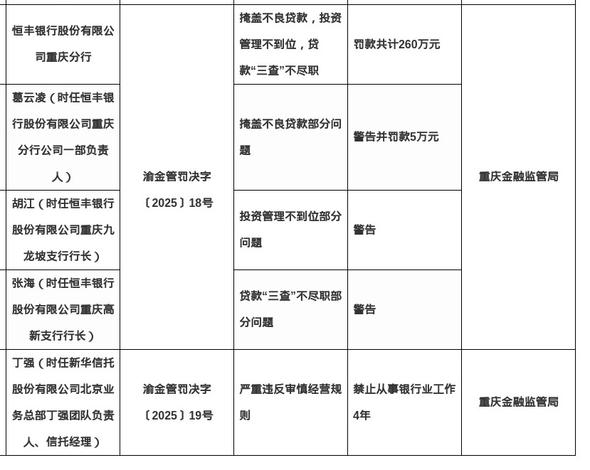 亨格(Hengfeg Bankqing)分支机构被罚款260万元人民币,包括无法收回的债务和其他类似情况。