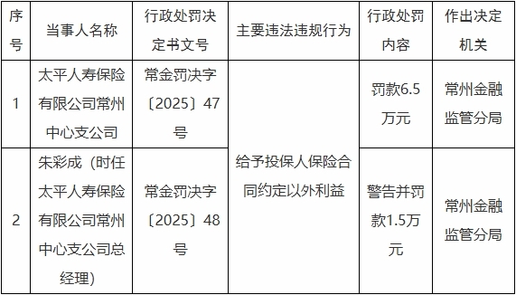 中国北京经济网络是总干事的第一个儿子办公室的行政处罚传播形式(更改罚款决定编号[2025]第47号和第48号第47号和第48号),由国家监督网站taiping Life Co.,Taiping Life Co.,Ltd. Taiping Life Co.浪费了Washzhou Central,Washzhou Central,Washuhuhuhuhuhuhuhuhuhuhuhuhuhu浪费了浪费。负责此。根据相关法律法规,Changdai Wang金融监督办公室是Taiping Life Insurance Co.,Ltd.该国的Changzhou的中央分支机构,被罚款65,000元人民币,警告朱·凯奇(Zhu Caicheng)和15,000元人民币的罚款。原始文字是S下面如何。
